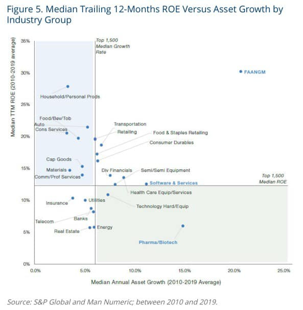 MAN goot zijn bevindingen in een kwadrantgrafiek (zie onderaan). U merkt hoe FAANGM in het diagram op een eenzame hoogte staat. De waarderingen van big tech rusten op stevigere fundamenten dan de meesten vermoeden.